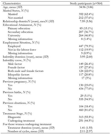 The final sample was composed of 564 women with infertility problems with an average age of 34.96 years, being most participants married (62.4%) with an average duration of the relationship of 7.6 years. Regarding educational attainment, 46.8% of the women included in the study had a university degree and 36.7% had completed secondary education. About the employment situation, the majority of the sample (79.3%) was employed and only 19.9% was not in the labour force.