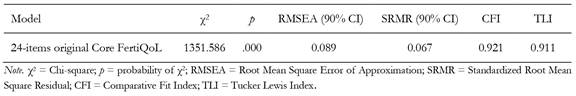 Despite the fact that the goodness of fit indexes of the original 24-item of the Core FertiQoL showed that all statistics presented appropriate values, namely: RMSEA and SRMR are lower than 0.09 and CFI and TLI are higher than 0.9 (Table 2), the principal component loadings of several items in the Core FertiQoL subscales were smaller than satisfactory (the principal component loadings of all 24 items in these four subscales ranged from 0.000 to 0.963).