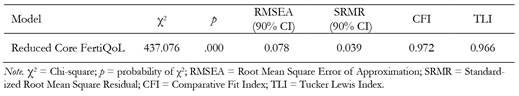 The goodness of fit indexes of this reduced version of Core FertiQoL presented satisfactory values (significant chi-squared; RMSEA and SRMR were lower than 0.09; CFI and TLI were higher than 0.9), as shown in Table 3.