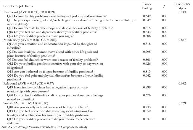 The reliability of FertiQoL was proven since the CR index of each factor was higher than 0.7 and the AVE higher than 0.5 (Hair et al., 2010) as shown in Table 4.