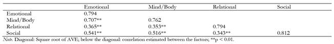 As presented in Table 4, all items showed a good factor loading in their corresponding subscale. However, after removing those 8 items from the original model, this model presented limitations in the Relational and Social subscales, which included only two and three items, respectively. The convergent validity of the reduced version of the FertiQoL model was demonstrated since the AVE for each of the four factors was higher than 0.5, as well as the factor loadings which present significant values over 0.6. Finally, as presented in Table 5, discriminant validity was confirmed because the square root of the AVE between each pair of factors was higher than the estimated correlation between those factors.