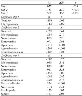 Table 2 displays the results regarding the prediction of PMD. All steps are statistically significant. In step 1 (control variables), being male plays a role as antecedent of PMD (β = -.154, p = .002), but is not involved in further models. The same happen with agreeableness (β = -.209, p < .001) and conscientiousness (β = -.127, p = .024) when Dark Tetrad is included (ΔR2 = .156). Thus, the final model explains 30.2% of PMD with openness (β = -.151, p = .002), Machiavellianism (β = .274, p < .001), psychopathy (β = .175, p = .002), and sadism (β = .167, p = .004) as predictors.
