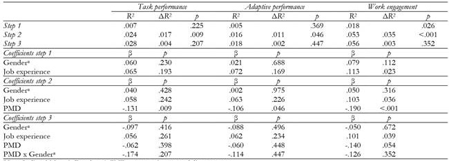 Firstly, we computed models using PMD as the only predictor. The third step, concerning the potential moderation between the variable gender and PDM, was not significant in any case. Results, displayed in Table 3, show that PMD contributes to explain 2.4% variance of task performance (β = -.131), 1.6% of adaptive performance (β = -.106), and 3.5% of work engagement (β = -.190).