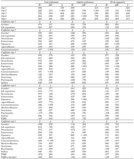 Secondly, we computed analyses with Big Five and Dark Tetrad, considering PMD in the last step, which are displayed in Table 4. As in the previous predictive models, the incorporation of the potential moderation between the variable gender and PDM (step 5), was not significant in any case. Thus, task performance and work engagement has Big Five, Dark Tetrad, and PMD as predictors. On the other hand, adaptive performance only has Big Five as predictors. Given that the focus of the present article is on PMD, we are going to discuss only models of task performance and work engagement.