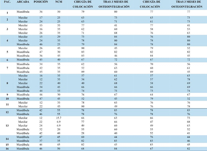 | PAC. | POSICIÓN | CIRUGÍA DE COLOCACIÓN | TRAS 3 MESES DE OSTEOINTEGRACIÓN |