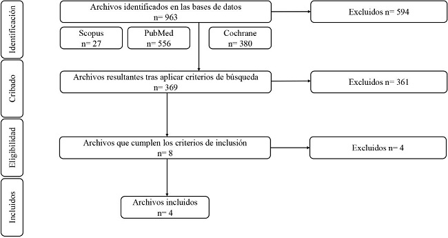se obtuvieron un total de 963 publicaciones. Tras aplicar los criterios de inclusión, eliminar los artículos duplicados y proceder al descarte manual, se incluyeron 4 artículos con un total de 122 pacientes.