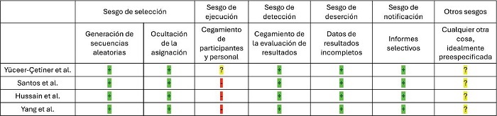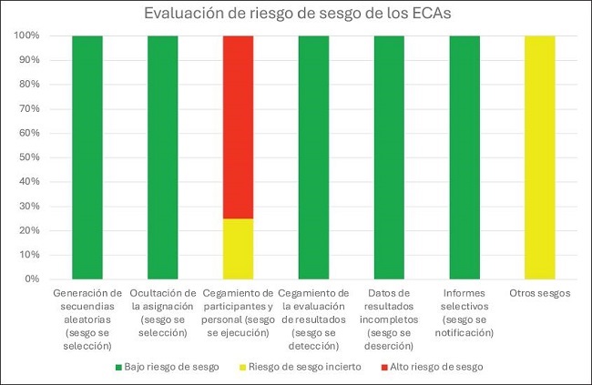Se evaluó el riesgo de sesgo de los ECAs a través de la herramienta de la Colaboración Cochrane (15), que consta de 7 ítems: generación de secuencia ocultamiento de la asignación, cegamiento de los participantes e investigadores, cegamiento de la evaluación de resultados, resultados de datos incompletos, informe selectivo de resultados y posibles fuentes de sesgo. Cada ítem puede puntuarse como de "alto riesgo", "bajo riesgo" o "poco claro". (Tabla 1)