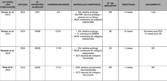 Se extrajeron los siguientes datos: autor (es), sitio y año de publicación, diseño del estudio, número de pacientes/alvéolos, sexo, edad, materiales de injerto, período de reentrada, seguimiento y resultados (véase anexos).