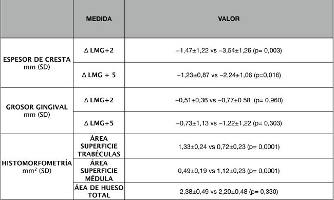 En el ensayo de Hussain y cols (19), se utilizó la tomografía computadorizada de haz cónico (TCHC) como método de estudio para comparar los cambios dimensionales de crestas preservadas con DA vs crestas que curaron espontáneamente. Evaluaban el grosor de la cresta en 2 puntos: 2 y 5mm apical al margen gingival (LMG+2 y LMG+5) en el momento de la exodoncia y 4 meses más tarde. Además, medían también el grosor gingival en estos mismos puntos y realizaron un estudio histomorfométrico con biopsias obtenidas con trefina, además de colocar implantes osteointegrados en dichas crestas. (Tabla 3)