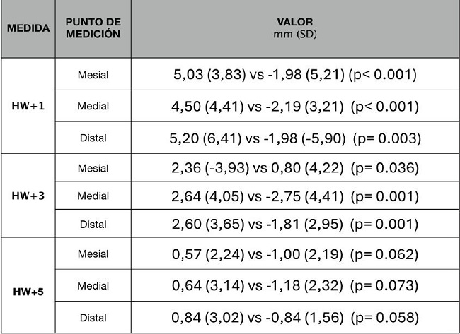 En este caso, la variación del espesor vestíbulo lingual (HW) fue medido en 3 puntos en sentido apico-coronal: 1, 3 y 5mm apical al punto más crestal (HW+1, HW+3 y HW+5), y 3 puntos en sentido mesio-distal (mesial, medial y distal): (Tabla 4)