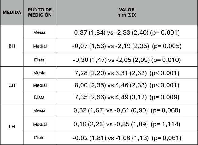 La variación en sentido vertical se midió en 3 puntos a su vez: bucal, central y lingual/palatino, (BH, CH y LH) y también en 3 puntos mesio-distales: (Tabla 5)