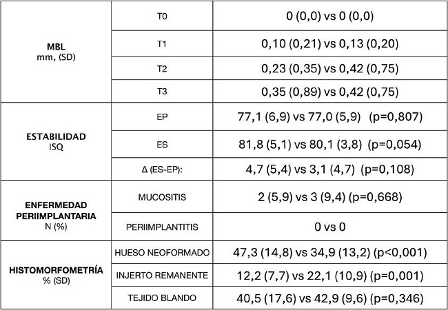 El único ECA incluido en el grupo 2 fue el de Santos y cols (11). Este estudio se centraba en la pérdida de hueso marginal (MBL) de implantes colocados 6 meses posterior al proceso de PCA en crestas preservadas con DA o con xenoinjerto (X), aunque también evaluaron otros parámetros como la estabilidad primaria (EP) y secundaria (ES) de los implantes, incidencia de mucositis y periimplantitis, valores histomorfométricos y resultados relacionados con el paciente (PROMs). (Tabla 6)