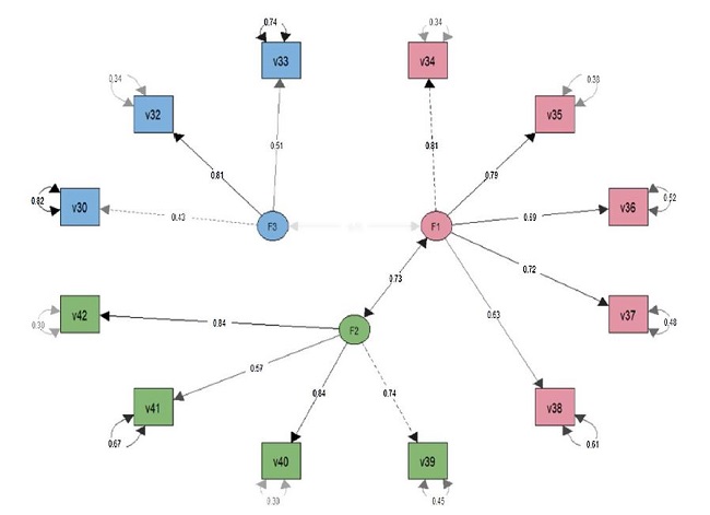 La relación de las 12 variables estudiadas con sus correspondientes factores es significativa (p < 0,01) (tabla 1), así como la covarianza entre F1 y F2 y entre F1 y F3. No es significativa, sin embargo, la relación entre F2 y F3 (tabla 2).
