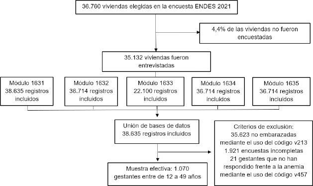 En este estudio se utilizó un diseño transversal retrospectivo con enfoque cuantitativo mediante el análisis secundario con la base de datos de la ENDES 2021, investigada y creada por el Instituto Nacional de Estadísticas e Informática (INEI).19 El muestreo fue probabilístico de tipo equilibrado, estratificado e independiente, además, se utilizó un diseño de muestreo por conglomerados en dos etapas para garantizar que las estimaciones fueran representativas a nivel nacional. Se seleccionó 36.760 viviendas en donde se incluyó a 38.635 registros de mujeres, pero se excluyeron a 35.623 registros que no estaban embarazadas, 1.921 por estar incompletas y 21 gestantes que no han respondido frente a la anemia quedando con una muestra efectiva de 1.070 registros de gestantes entre 12 a 49 años (ver figura 1).