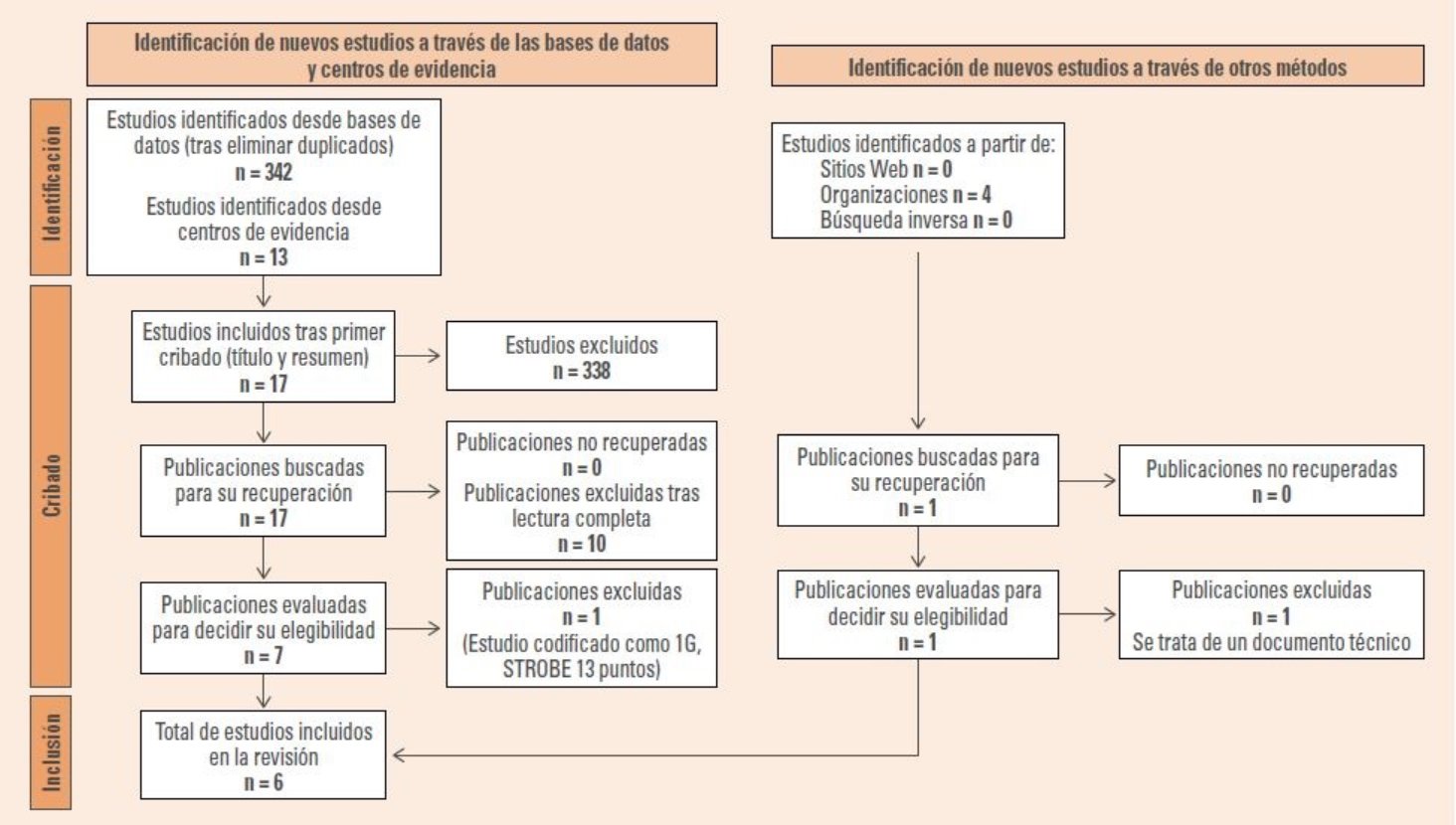 De 359 referencias identificadas tras revisar título y resumen, se descartan 338 estudios encontrados a través de bases de datos y centros de evidencia y 3 identificados mediante otros métodos (GNEAUPP), por no responder a los criterios de inclusión expuestos (fig. 1).