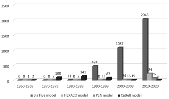 The empirical support that each of these models had (and still receives) is diverse, with the Big Five model having the highest level of endorsement and consolidation after hundreds of independent and cross-cultural studies (Sanz, 2008). To determine the current levels of support for those taxonomies of personality traits, we conducted a search in PsycInfo with the following key words-including key words related to the main instruments that operationalize the different taxonomies of personality traits: (1) for the Big Five model: “Big Five”, “five factor model”, “5 factor model”, “NEO-PI” OR “NEO-FFI”; (2) for the HEXACO model: “HEXACO” OR “HEXACO-PI-R”; (3) for the PEN model “EPI”, “EPQ”, “EPQR”, “PEN” OR “PEN model”; and (4) for Cattell model: “16PF” OR “Cattell model”. The date range for this search was 1960-2020. Figure 1 shows how the Big Five model clearly has the most results, with a significant difference compared to the other three models.