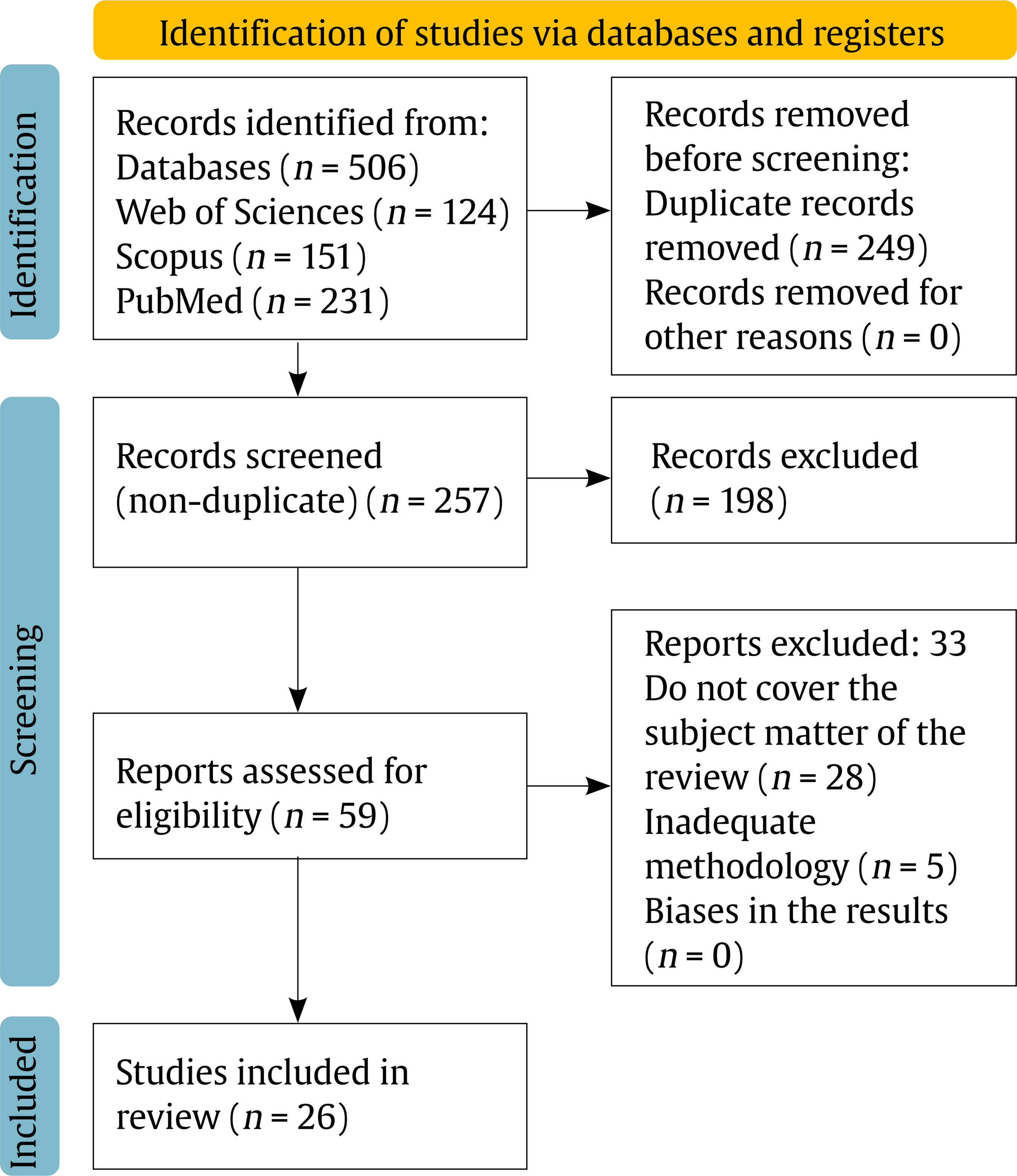 After eliminating all duplicate articles from the search method, a total of 257 potential articles were collected for the study. A total of 198 items were discarded after reading the title and abstract because they did not address the objectives of the review. A new manual selection was performed after a thorough reading of the remaining articles. This procedure acquired 26 items that met the eligibility requirements of the study. Figure 1 shows the procedure for searching and choosing data sources.