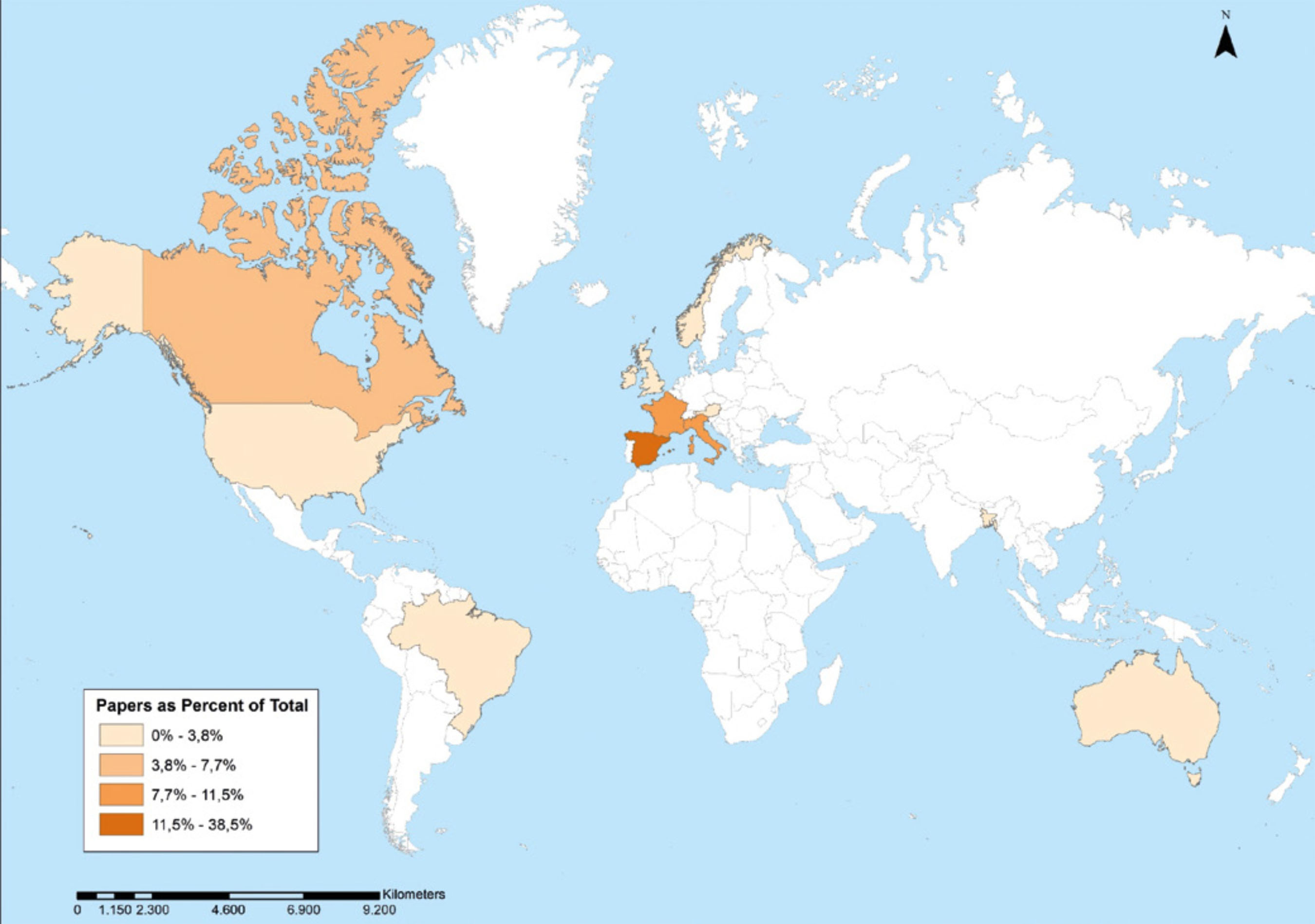 The selected articles were published between 1991 and 2019, although most of the research was published in the 2000s (61.5%). Of the total selected studies 20 were published in English and 6 in Spanish. In addition, the studies were conducted in geographically different countries (Figure 2). In this sense, there is representation from 12 countries located in four continents, although most were developed in European countries (n = 10, representing 76.9%). Specifically, the distribution by country is Spain (n = 10), France (n = 3), Italy (n = 3), Canada (n = 2), Ireland (n = 1), Brazil (n = 1), United Kingdom (n = 1), United States (n =1 ), Norway (n = 1), Austria (n = 1), Australia (n = 1) and Bangladesh (n = 1).