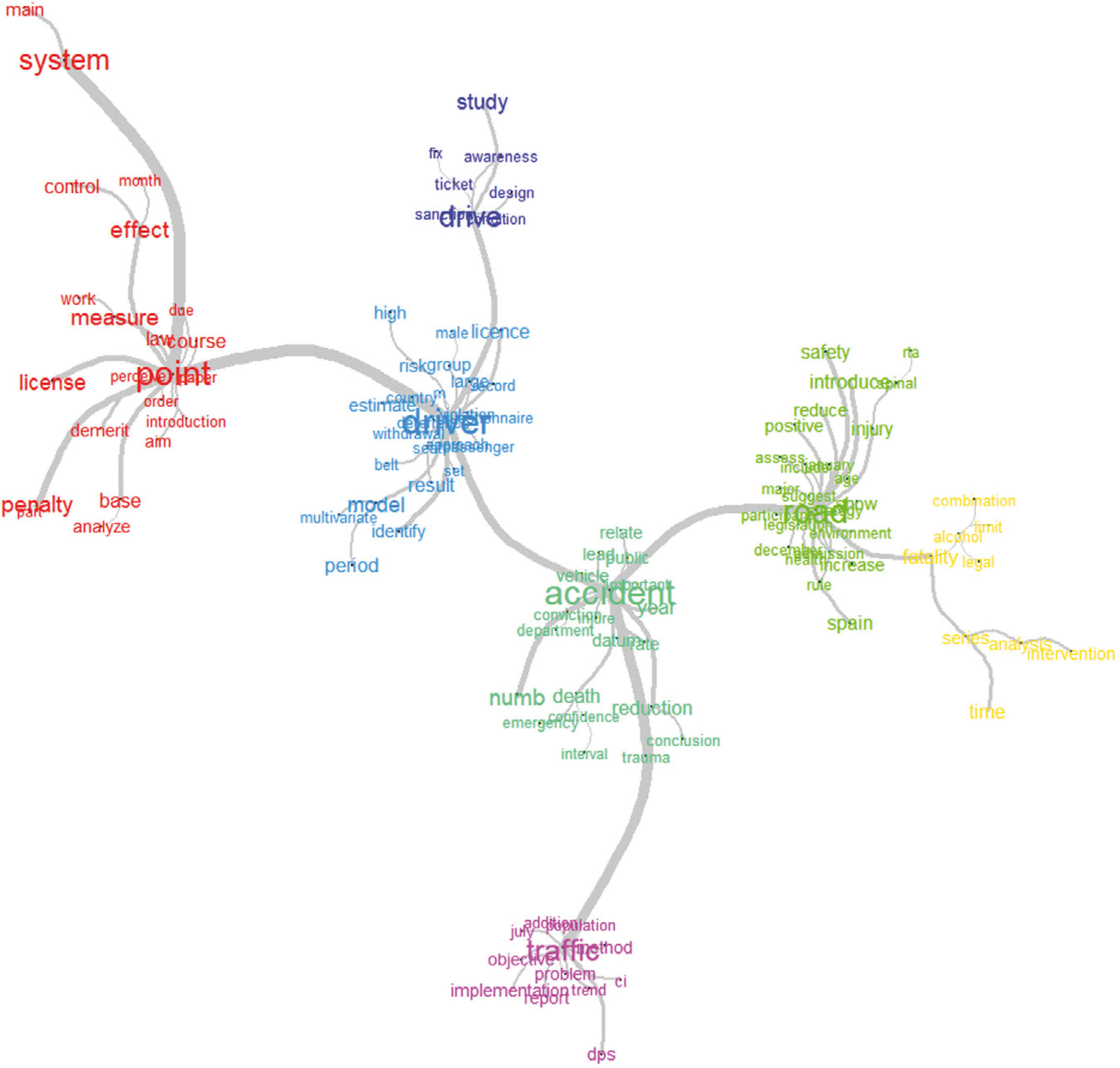 Finally, a large community with various related branches can be observed. This whole block is composed of terms framed in the consequences of performing risky behaviors. Specifically, words such as "accident", "death", "reduction", "vehicle", "rate", "trauma", or "emergency" are identified. These, in turn, are linked to terms such as "traffic", "implement", "population", "problem", "road", "injury", "increase", "safety", or "rule". In this context, these terms reflect the complexity of road safety and how legislative elements such as the driver's license point-based system can have an impact on the actions of drivers and, consequently, on the rate of accidents and injuries on the road. This network of concepts is also related to a small block of terms such as "analysis", "fatality", "legal", "intervention", or "combination", a network of terms framed in the process after the loss of points and the withdrawal of the license, evaluating the effectiveness of intervention on drivers.
