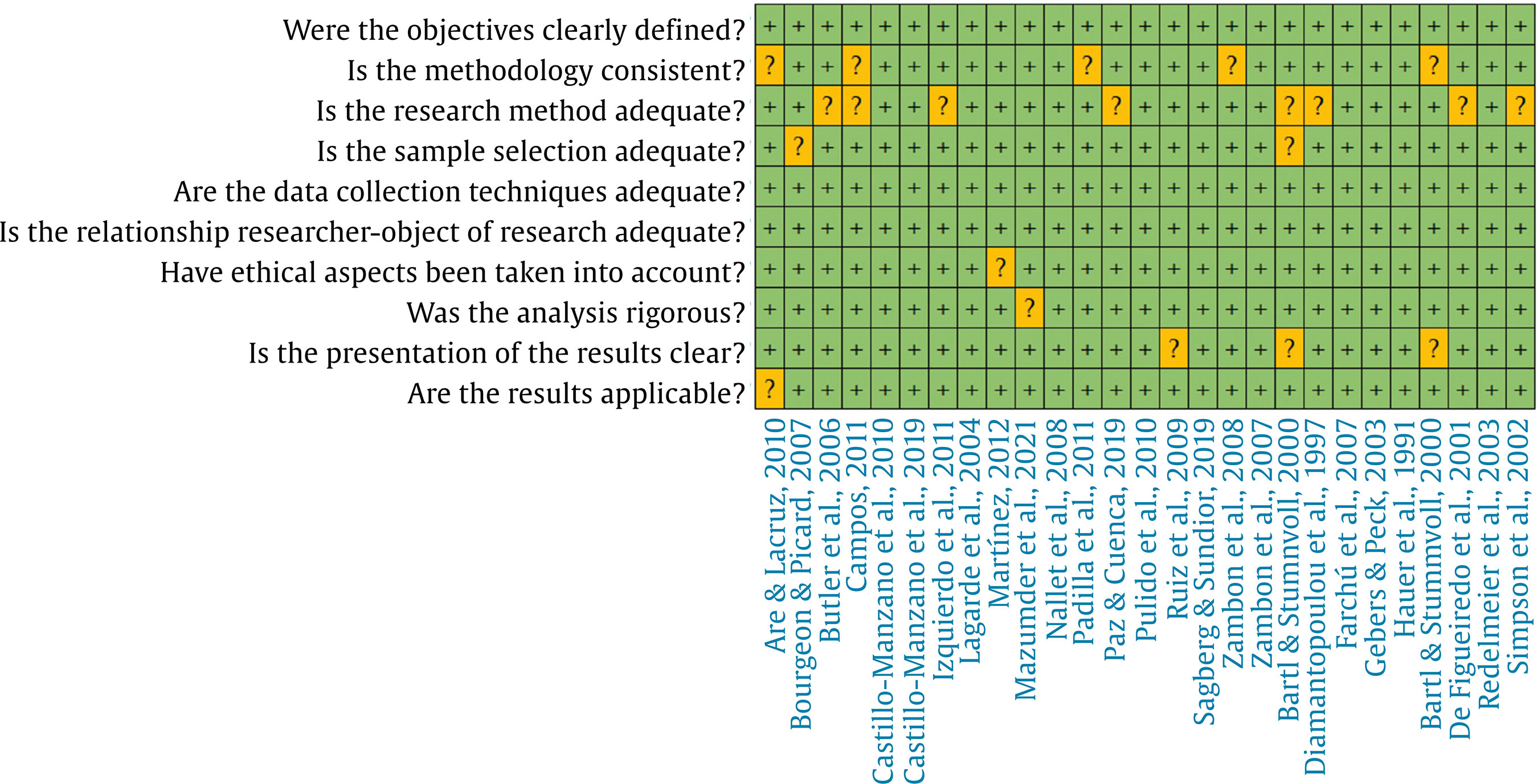 The quality assessment methodology provided by the Critical Appraisal Skills Program (CASP) was used to ensure that no included study could influence or distort the results of this systematic review. Through a set of ten specific questions, this tool makes it easier for the evaluators to assess the level of rigor, reliability, and relevance of each study (Long et al. in 2020). The results of the evaluation of the selected publications are presented in Figure 5. It should be noted that all studies were incorporated into the review due to their low risk of bias, and no articles previously selected in the screening phase were excluded during this process.