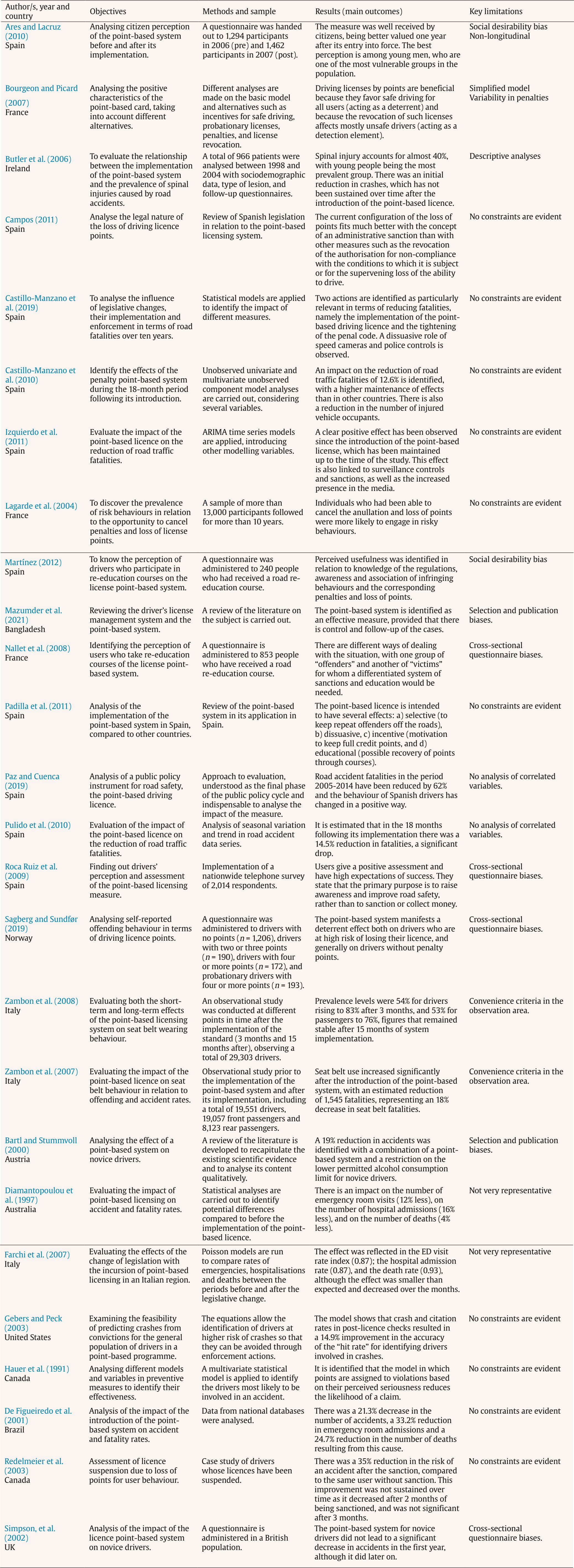 In relation to the specific topic analyzed, five groups of articles were identified. In the first place, those focusing their research on the potential impact of the introduction of the point-based license on accident rates and fatalities or injuries, which account for 26.9% (n = 7). Secondly, there is a group of articles that evaluate its impact but only in relation to the prevalence of infractions, risky behaviors, and/or potential changes in safe behaviors, representing 26.9% of the total (n = 7). A third group of articles grouped both the effects of the driver's license point-based system on accident rates and on infractions committed by users, which represent 23.1% (n = 6). In this regard, it should be noted that the bulk of the articles evaluate the impact of the introduction of the point-based license on different variables such as accident rates, driver infractions or both, with a total of 20 articles (76.9%). Additionally, there are four articles that focus on evaluating the social perception of this measure, which represent 15.4% of the total (n = 4). And finally, there is a very small set of articles that seek to analyze the legal aspects of the legislation or regulations presented by the laws regulating points systems, which represent 7.7% of the total (n = 2). From the point of view of the study methodology used, an important part of the studies employ epidemiological methods (38.4%, n = 10). These are retrospective studies that use databases of road accidents from official entities or institutions, as well as official figures on infractions and penalties to evaluate the prevalence of accidents and infractions, as well as their frequency and/or severity. Some studies use observational methods, based on the visualization, recording and analysis of information in the real environment. Thus, this type of research represents 15.4% (n = 4) and mostly corresponds to the establishment of specific observation points on highways or public roads to record accident data or compliance with regulations. There are also studies (23.1%, n = 6) that have used a survey method in which a representative number of participants have been asked about their behaviors, being able to evaluate a specific group of users such as novice drivers or drivers who have received driver re-education courses after the loss of all their license points, or at a generic level to know the perceptions of the driving license points system in the general population. Finally, four review articles were included (15.4%, n = 4), in which the legislation and legal systems that regulate this measure were analyzed, or the existing scientific literature was compiled and evaluated in different bibliographic sources that analyzed aspects related to the implementation of the points system.