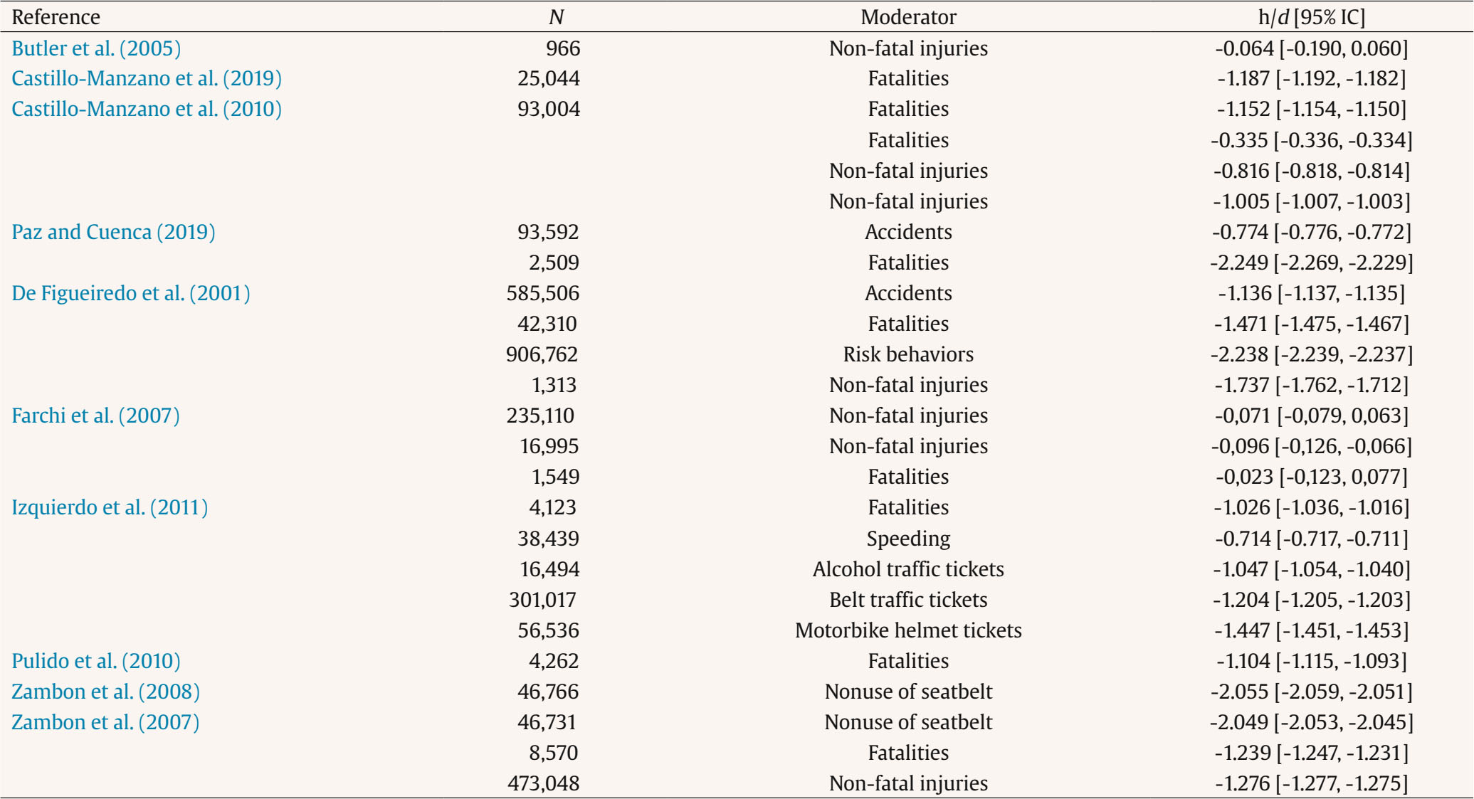 Additionally, two limitations have been observed from primary studies of the meta-analyses. First, the extremely high heterogeneity of the data from primary studies. Second, the limited number of observed effects limits the study of moderators. As for this, the effects attributed to point-based driving license on the use of seatbelt, drug, alcohol, or mobile phone use, or speeding could not be studied. More evidence is necessary on other markers of the effects of the point-based driving license. Thus, future literature should be focused on the effects on the use of seatbelts, consumption of drug/alcohol, and speed.