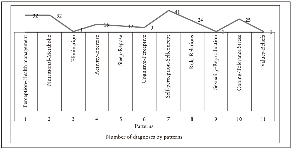 According to the functional pattern nursing evaluation, the nursing diagnoses, indicators, interventions and main activities were prioritised, as per the online tool NNNConsult13, which enabled the standardised languages developed by NANDA International, the results of the NOC, the interventions of the NIC and links between them to be quickly consulted (Figure 1 and Table 2).
