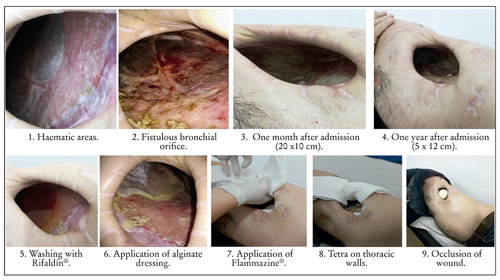 The care protocol when the patient was admitted consisted of applying seven swabs with an antiseptic: internally applied 10% povidone iodine. In the hospital, treatment was applied by washing with hydrogel in solution (Protosan®) and in October 2016 the treatment was changed to a wash with physiological saline solution and a sponge with soapy chlorhexidine to clean the cavity of the slough and exudate from the application of silver sulphadiazine cream (Flammazine cerio®). The lung was not rubbed but dried and hydrofibre dressings with ionic silver (Aquacel Plata®) dampened with saline solution or transparent hydrogel (Nugel®) were applied to the lung, to prevent continuous exposure of the silver sulphadiazine to the lung. It was dried and three swabs filled with half a swab impregnated with silver sulphadiazine were applied. The side of the compress with silver sulphadiazine was placed in contact with the thoracic wall and the diaphragm (one in the anterior and diaphragmatic region, another in the superior and anterior area, and another posterior). Two or three rolled compresses were applied separately on the hole in the wall, and the ends of the three swabs were folded on top.