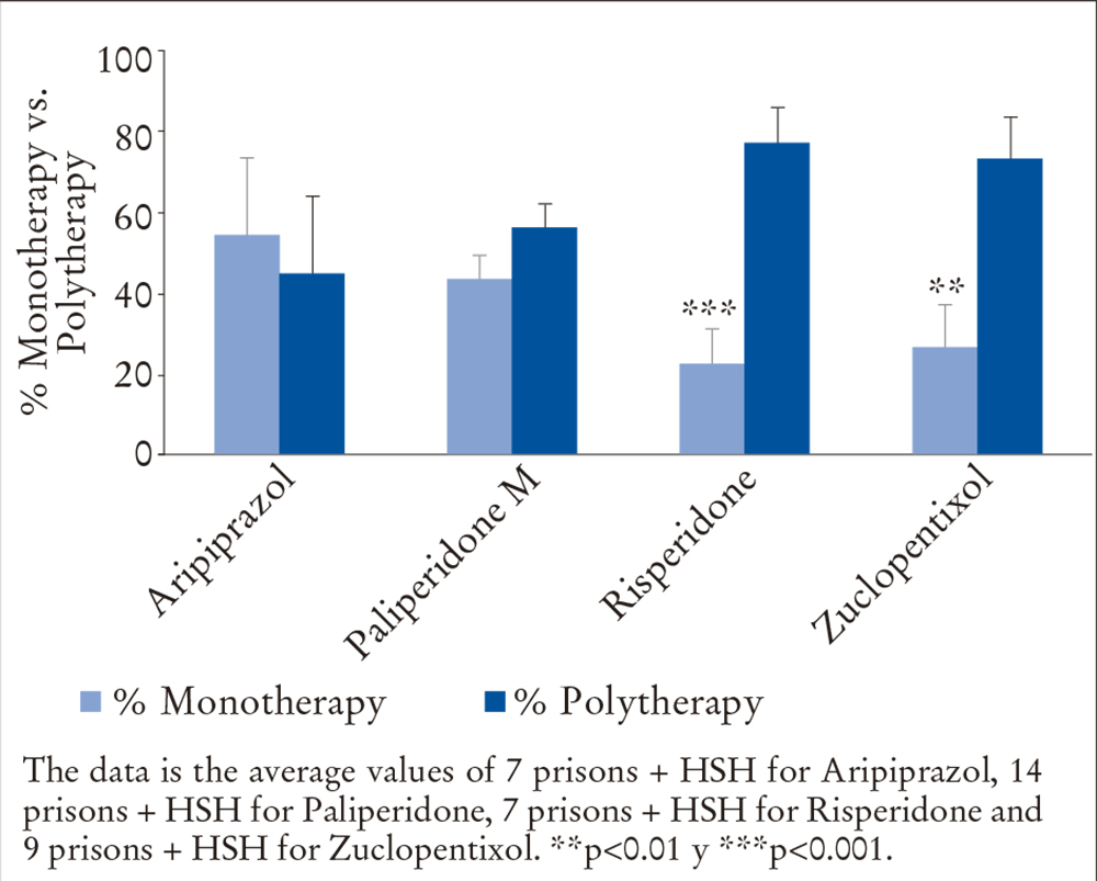 Of the 11,953 inmates included in the study, 1,851 (15.5%) received prescriptions for an antipsychotic, 415 in penitentiary psychiatric hospitals (87%) and 1,436 in prisons (12%), which is a much higher prevalence than that found in the population. Regarding the prescription pattern of LAIs, paliperidone is the most widely prescribed in prison psychiatric hospitals and prisons, followed by aripiprazole, zuclopenthixol and risperidone. Finally flufenazine, olanzapine and paliperidone quarterly, which are scarcely represented. Of the 292 patients with LAI, 41% (121 patients) are with monotherapy and 59% (171 patients) are with polytherapy, which is similar to the data found in the bibliography.