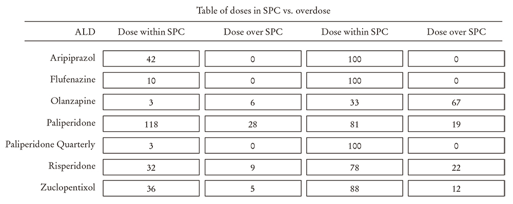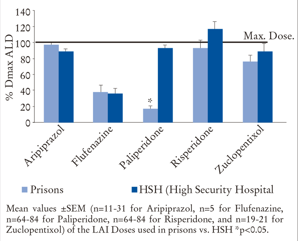 • The LAI that is most frequently used above the maximum in the therapeutic range of the summary of product characteristics is risperidone, and this tends to take place more frequently in high security hospitals than in prisons.