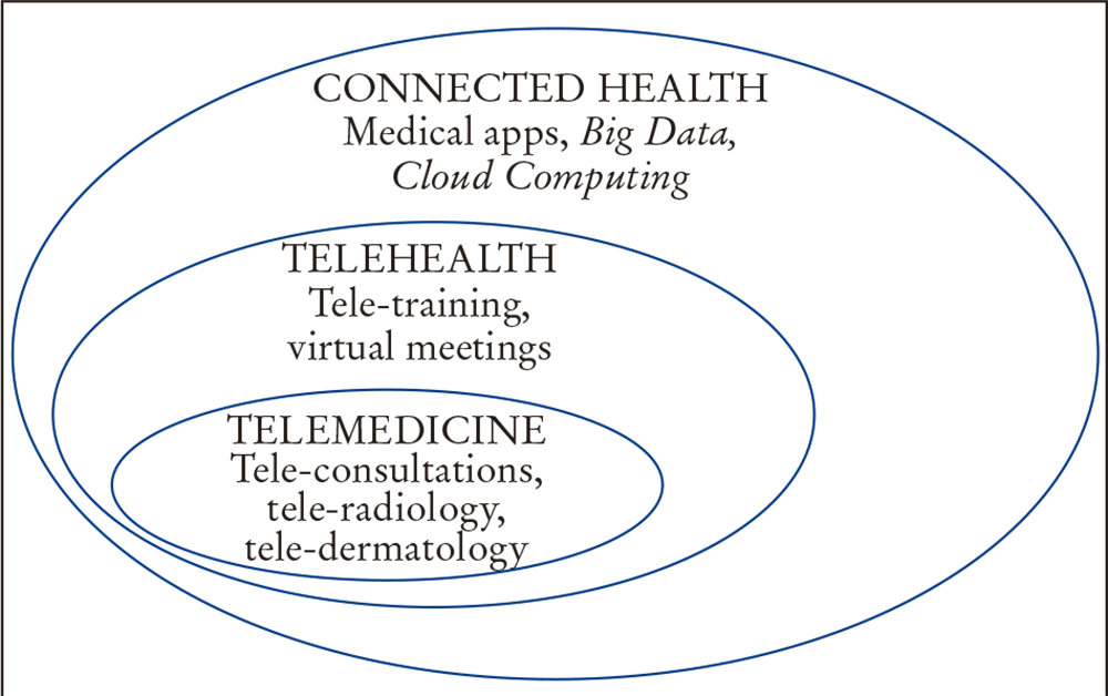 TMD is the long-distance exchange of clinical information, in which information and communication technologies (ICT) are used. Although there are many definitions1, we selected the one used by the American Telemedicine Association (ATA), which describes it as “the use of medical information exchanged from one site to another via electronic communications to improve patients’ health status”2. Telehealth, which is a concept very closely linked to TMD, is a broader term that covers all forms of long-distance health service provision, including non-clinical services2, such as tele-training, web portals for patients, or virtual meetings of health teams. There are new terms to define a hyper-connected world that is changing the way we understand health. Apps for health and wellbeing for mobile devices, between 400,000 and 500,000 in 20183, body and local sensors, the new era of the Internet of Things, in which any everyday object is computerised and connected4, cloud computing services, or the potential of big data to improve the quality of healthcare5, are examples of an ecosystem in which the definition of telehealth falls short of what is actually happening, and where new expressions are being coined, such as health 2.0, digital health or connected health are being coined, which, as the Spanish Society of Healthcare Information Technology (SEIS) declares6, would be “the final evolutionary link arising from the introduction of information and communication technologies into healthcare” (Figure 1).