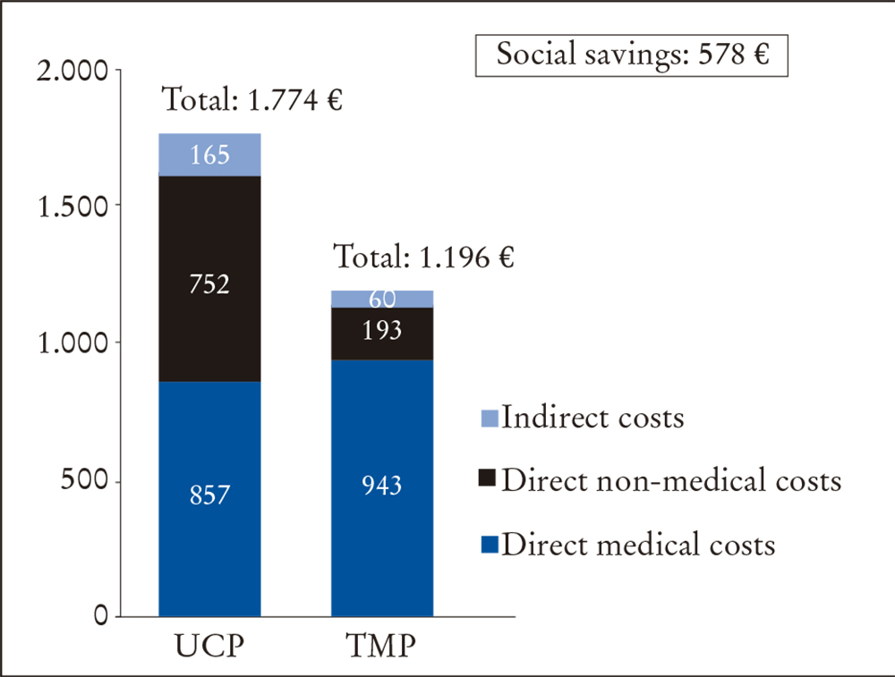 Figure 2. Costs per patient in euros (€) of management of hepatitis C virus (HCV) as part of the strategy of a telemedicine program (TMP) and in usual clinical practice (UCP). January-December 2016, at Dueso Prison.