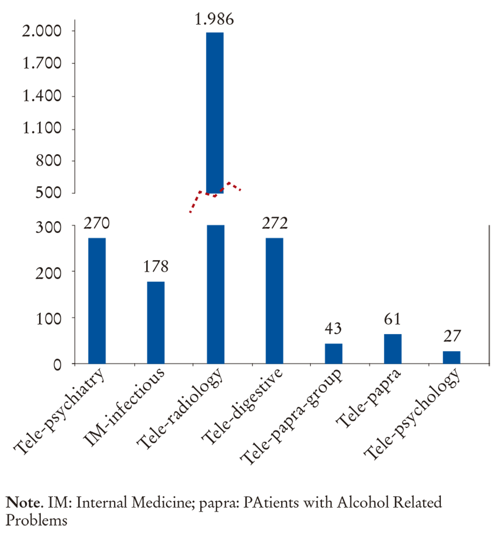 Tele-psychiatry: a speciality with considerable demand, since the prison systems receive a high proportion of persons diagnosed with mental disorders, along with others suffering from substance consumption disorders. According to the report on the prevalence of mental disorders in Spanish prisons (PRECA), the prevalence of psychiatric illnesses in the Spanish prison population is five times higher than that of the general public24. Mental health is seen as the ideal scenario for applying TMD, as diagnosis and treatment are mostly carried out via audiovisual communication. Alongside tele-psychiatry, other services are offered such as tele-psychology and TMD for treating addictive behaviours (in individual and tele-group modalities) by hospital in the Cantabria public network.