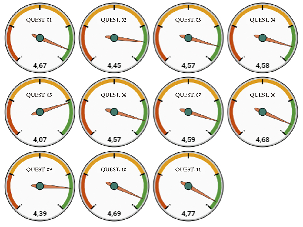 | Confidence Interval (CI 95%) | 4,5 to 4,7 | 4,3 to 4,5 | 4,4 to 4,6 | 4,4 to 4,6 | 4,0 to 5,0 | 4,4 to 4,6 | 4,4 to 4,6 | 4,5 to 4,7 | 4,2 to 4,5 | 4,5 to 4,7 | 4,6 to 4,8 |
