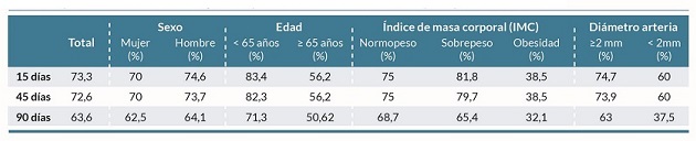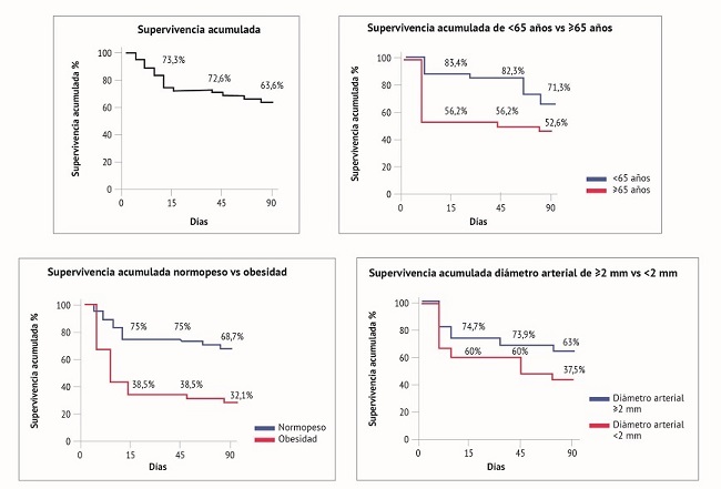 La supervivencia acumulada de las FAVn a los 15, 45 y 90 días de maduración fue de 73,3%, 72,6% y 63,6% respectivamente. Las personas ≥65 años, con FAVn realizadas con diámetros arteriales <2 mm y con obesidad, presentaban menor supervivencia acumulada a los 15, 45 y 90 días de maduración. La supervivencia acumulada se reducía drásticamente a los 90 días de maduración en los pacientes ≥65 años (50,6%), en pacientes con FAVn realizadas con un diámetro arterial <2 mm (37,5%) y en pacientes con obesidad (32,1%) (tabla 3 y figura 1).