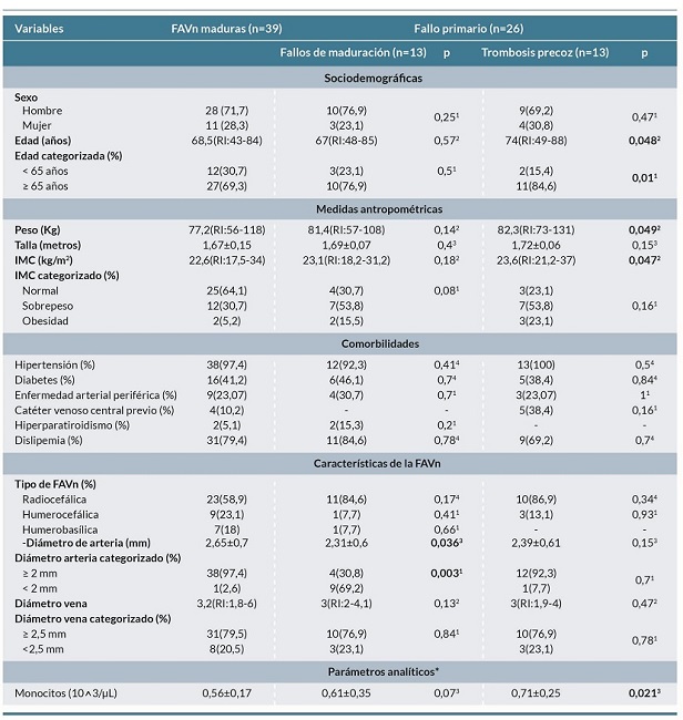 Se encontró asociación estadísticamente significativa entre el FM de las FAVn y el diámetro de la arteria empleada para realizar la FAVn (p= 0,036). Además, la TP de las FAVn, se asoció significativamente con la edad (p=0,048), el peso (p=0,049), IMC (p=0,047) y los monocitos (p=0,021) (tabla 1).