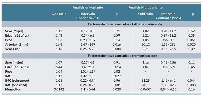 Tabla 2. Análisis univariante y multivariante: factores de riesgo asociados a los fallos de maduración y a la trombosis precoz.