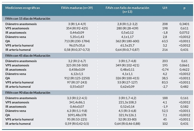 Se realizó seguimiento ecográfico a los 15, 45, y 90 días de maduración a 52 FAVn, el 75 % fueron FAVn maduras (n=39), y un 25% fueron FAVn con FM (n=13). En todas las mediciones ecográficas, el diámetro de la vena, el QA y la VPS en la arteria humeral fueron significativamente mayores en las FAVn maduras vs FAVn con FM (p <0,001). Además, se encontró que la VPS de la anastomosis a los 90 días de maduración era significativamente mayor en las FAVn maduras vs FAVn con FM (p <0,001) (tabla 4 y figura 2).