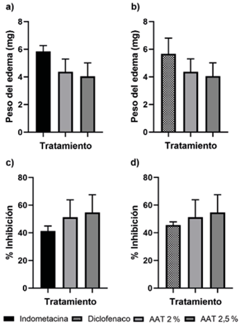 Figura 1. Resultados de la evaluación de efecto antiinflamatorio (promedio ± DE). a) Comparación del peso del edema de los dos grupos de AAT con el control positivo de indometacina. b) Comparación del peso del edema de los dos grupos de AAT con el control positivo de diclofenaco. c) Comparación del porcentaje de inhibición de los dos grupos de AAT con el control positivo de indometacina. d) Comparación del porcentaje de inhibición de los dos grupos de AAT con el control positivo de diclofenaco.