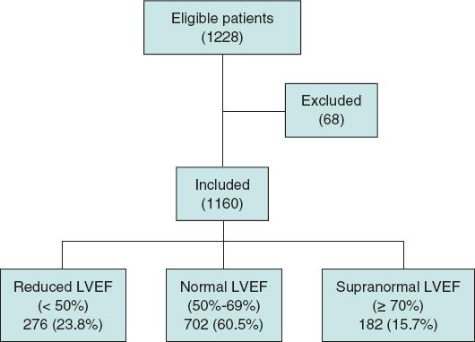 The aim of this study was to evaluate the prognosis of patients with supranormal LVEF (≥ 70%) undergoing TAVI and study their echocardiographic and clinical characteristics.