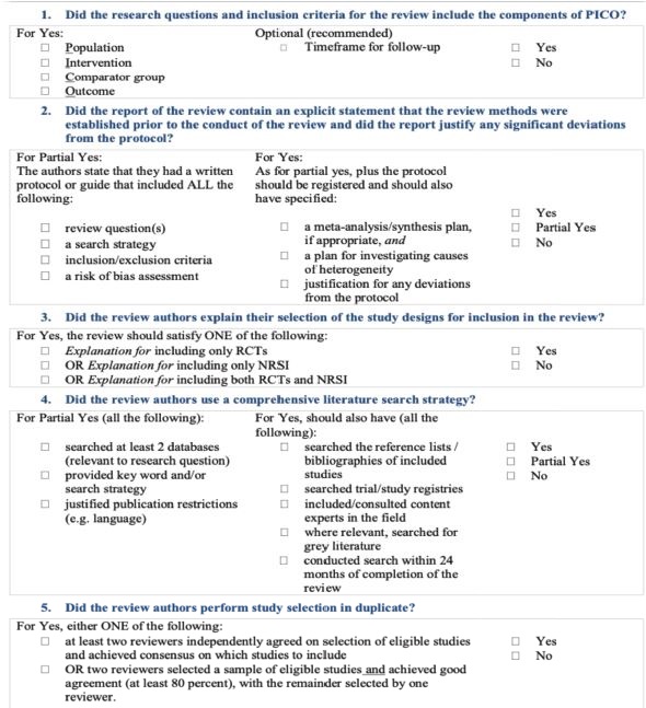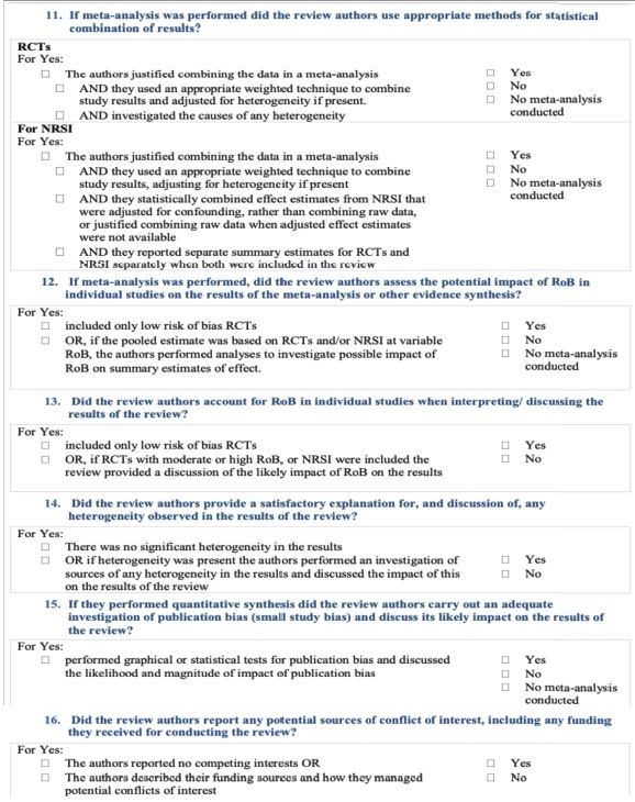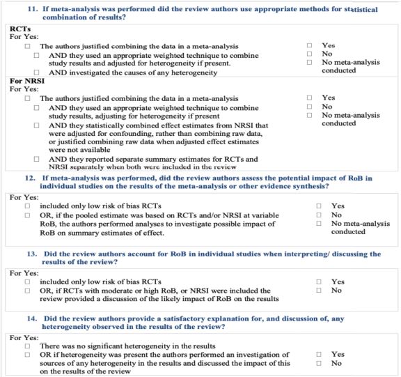 Si: el ítem evaluado cumple con la condición cuestionada. No: el ítem evaluado no cumple con la condición evaluada, no puede ser contestada o no es aplicable. Sí parcial (Sip): el ítem evaluado se cumple parcialmente. No MA: no se realizó meta análisis