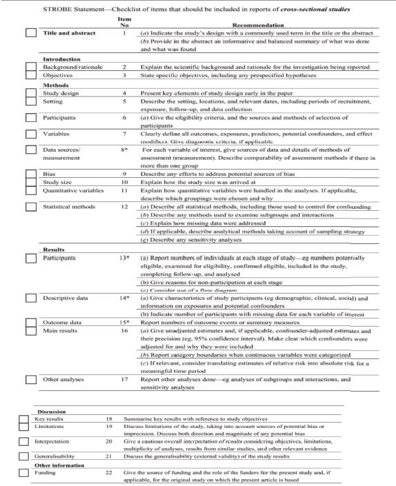 La calidad de las RS/metaanálisis se evaluó utilizando el instrumento AMSTAR 2 (Assessment of Multiple Systematic Reviews) que consiste en 16 ítems en forma de interrogantes simples (sí/no/sí parcial) de acuerdo con las características halladas en los estudios. De los 16 ítems son 7 los puntos críticos que son la base cardinal de la evaluación a través del uso de esta herramienta(17) (Figura 1). Para los estudios observacionales se utilizó la declaración STROBE (Strengthening the Reporting of Observational studies in Epidemiology) que consiste en 22 ítems en forma de checklist que deben formar parte de un estudio adecuadamente diseñado. Se asigna de forma individual un puntaje de 0 a 1 por ítem, siendo el 1 la nota máxima. A mejor puntuación mayor calidad del estudio y de la evidencia(18) (Figura 2).