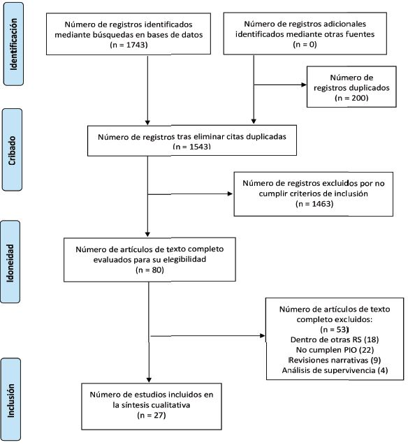 Seleccionamos 27 estudios de las 1743 referencias recuperadas inicialmente. De estas 1743 referencias, se eliminaron 200 duplicados obteniendo 1543 artículos. Tras la lectura de título y resumen, se llegaron a eliminar 1463 estudios que no cumplían con los criterios de inclusión previamente descritos. Tras la selección de estudios, tomando en consideración los criterios de inclusión y exclusión, se obtuvieron 80 artículos que pasaron a la lectura crítica de texto completo. De estos 80, 18 fueron eliminados por encontrarse dentro de otras RS, 22 no cumplían criterio PIO y 13 correspondían a diseños de estudios excluidos para esta revisión. Finalmente restaron 27 artículos que sí fueron incluidos en la revisión final. (Tabla 8). Los 27 artículos incluidos en la RS según su diseño se agrupan en: 11 RS con metaanálisis, 12 cohortes y 4 casos y controles anidados.