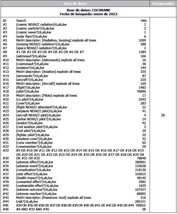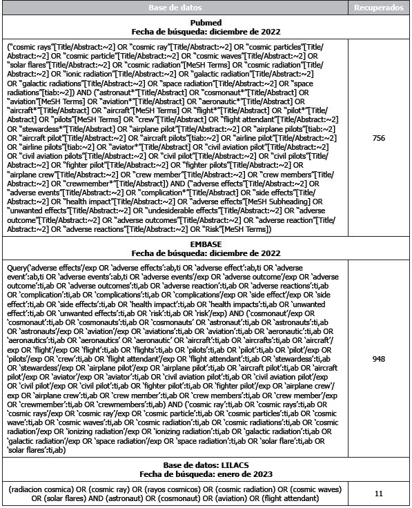 RS de la literatura científica. La identificación de estudios se llevó a cabo mediante una búsqueda en las siguientes bases de datos: MEDLINE (PUBMED), EMBASE, LILACS y COCHRANE utilizando la metodología PIO (Población, Intervención y Outcomes/Resultados) para dar respuesta a la pregunta de investigación. Se diseñaron diversas estrategias de búsqueda (Tabla 1) para la identificación de estudios usando terminología estandarizada consultando el DeCS (Thesaurus de los Descriptores en Ciencias de la Salud), MESH y libre. Se adaptó cada término al tesauro específico de cada buscador con la finalidad de obtener mayor nivel de especificidad en las búsquedas. Igualmente, se consultaron páginas Web de prevención sanitaria aeronáutica nacionales e internacionales. Se llevó a cabo también una revisión manual de las referencias bibliográficas de los documentos encontrados, para localizar estudios no localizados en la búsqueda electrónica.