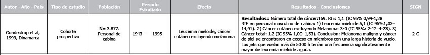 El estudio de cohortes prospectivo de Gundestrup et al. 1999(39) evaluó el desarrollo de leucemia mieloide y otros tipos de cánceres en una cohorte de 3.877 tripulantes de cabina. Un total de 169 trabajadores desarrollaron, RIE (IC95%): 1,1 (0,94-1,28). La RIE (IC95%) para el personal masculino de cabina con leucemia mieloide fue de 5,1 (1,03-14,91) sobre todo si tenían más de 5000 horas de vuelo. De igual forma, hubo un exceso de melanoma maligno RIE (IC95%): 3,0 (2,12- 4,23).