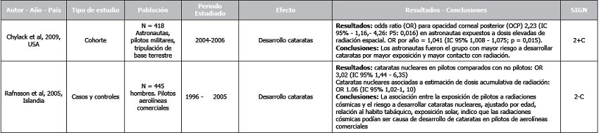 Rafnsson et al. 2005(40) realizaron un estudio de casos y controles con una cohorte de 445 hombres pilotos de aerolíneas comerciales, con el propósito de estudiar la aparición de cataratas. Se observaron cataratas nucleares en pilotos comparados con no pilotos, OR (IC95%): 3,02 (1,44-6,35). La aparición de cataratas nucleares estaba asociada a estimación de dosis acumulativa de radiación, OR (IC95%): 1.06 (1,02-1, 10).