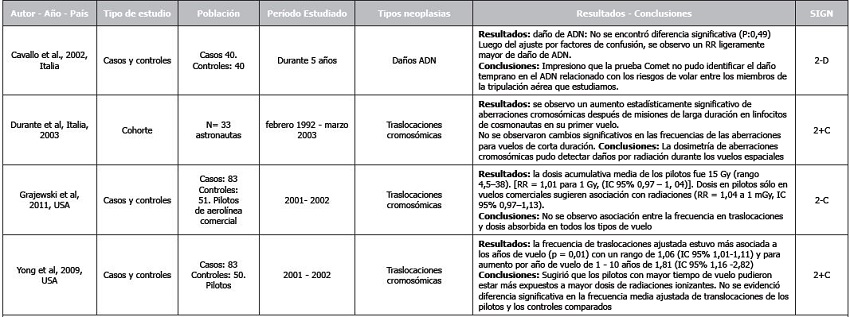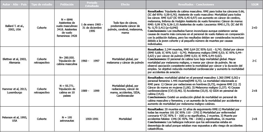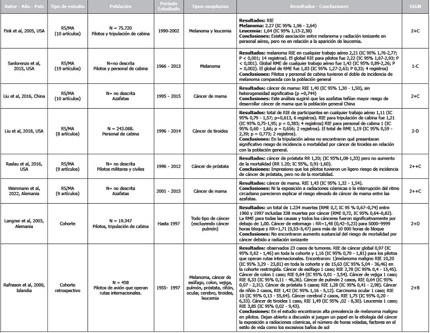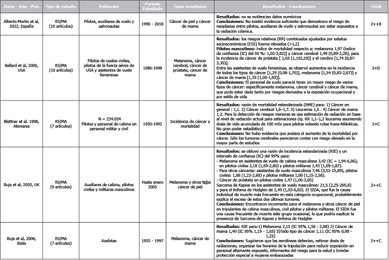 La RS de Blettner et al. 1998(21), evaluó la incidencia y mortalidad por cáncer en 234.034 pilotos y personal de cabina militar y civil. La revisión incluyó 7 estudios y encontró una razón de mortalidad estandarizada (RME) para todos los cánceres de 1,1; para cáncer cerebral de 1,6-1,7; para leucemia de 1,6; y para cáncer de mama de 1,2. Los autores no encontraron evidencia que avale un aumento de la mortalidad por cáncer. Sólo los tumores cerebrales parecieron contar con riesgo elevado en la mayor parte de estudios.