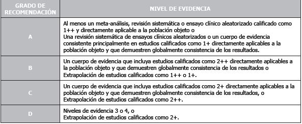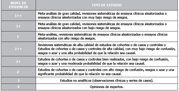 Por último, el nivel de evidencia de los estudios incluidos y el grado de recomendación se evaluaron mediante los criterios SIGN (Scottish Intercollegiate Guidelines Network) la cual es una guía que facilita el reconocimiento crítico de los estudios mediante la frecuencia de exposición, tipo de estudio y población estudiada (Tabla 2, Tabla 3 y Tabla 9). Desde el más alto (1 ++) correspondiente a metaanálisis correctamente diseñados o ensayos clínicos hasta(4) opinión de expertos(19).
