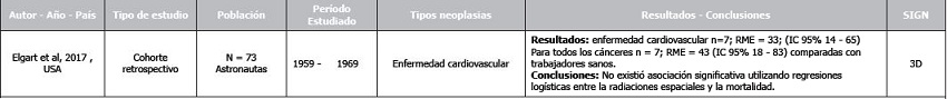 El estudio de cohortes retrospectivo de Elgart et al. 2017(32) evaluó la existencia de factor de riesgo cardiovascular, en 73 astronautas estadounidenses. Se encontró una RME=33 (IC95%: 14-65). La RME para todos los cánceres fue de 43 (1-83). No se encontró asociación entre radiación espacial y mortalidad