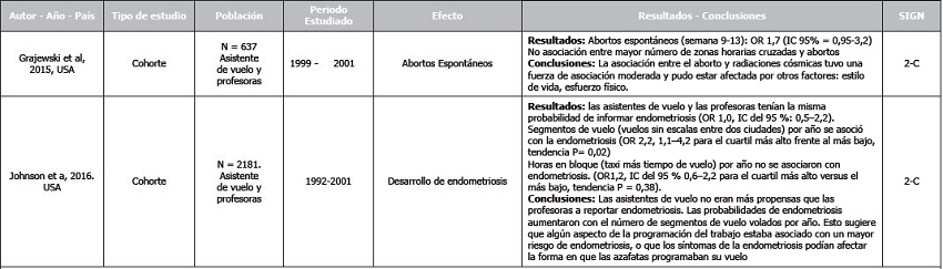 Entre los efectos ginecológicos, Grajewski et al. 2015(36) describen que la relación entre el aborto y radiaciones cósmicas tuvo una fuerza de asociación moderada y pudo estar afectada por otros factores: estilo de vida, esfuerzo físico. No existe asociación entre mayor número de zonas horarias cruzadas y abortos. Johnson et al. 2016(37) concluyeron que las asistentes de vuelo no eran más propensas que las profesoras a reportar endometriosis. Las probabilidades de endometriosis aumentaron con el número de segmentos de vuelo volados por año, sugirieron que algún aspecto de la programación del trabajo producía mayor riesgo de endometriosis, o que los síntomas de la endometriosis afectaban la forma en que las azafatas programaban sus jornadas de vuelo.